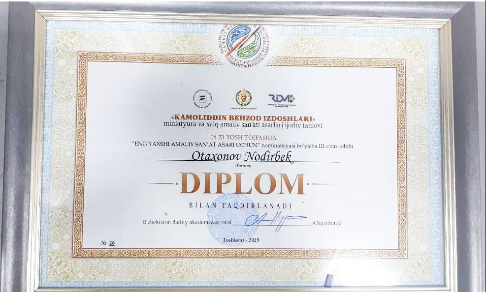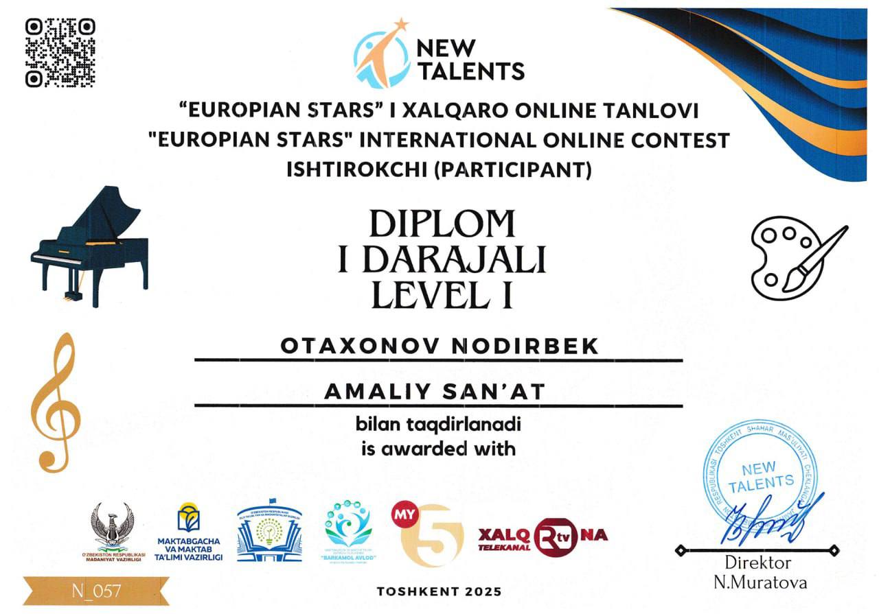 Toshkent shahrida boʻlib oʻtgan “European Stars” I xalqaro online tanlovida Tasviriy san'at va muhandislik grafikasi ta'lim yo‘nalishi talabasi Otaxonov Nodirbek Amaliy san’at yo‘nalishi bo‘yicha ishtirok etib, I darajali diplom bilan taqdirlandi.