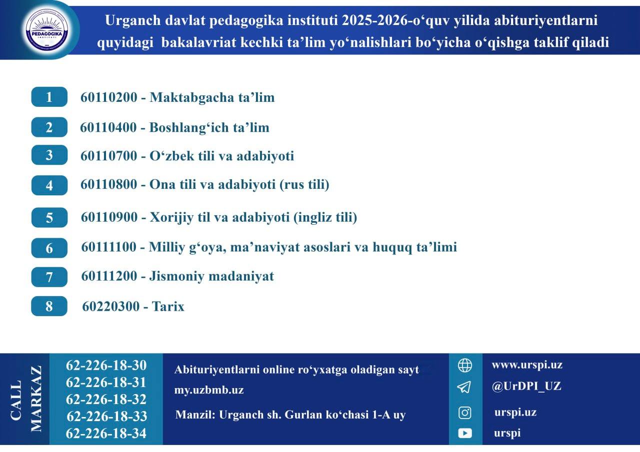 Urgench State Pedagogical Institute invites applications for admission to the above undergraduate full-time and evening programs and master's degrees in the 2025-2026 academic year!