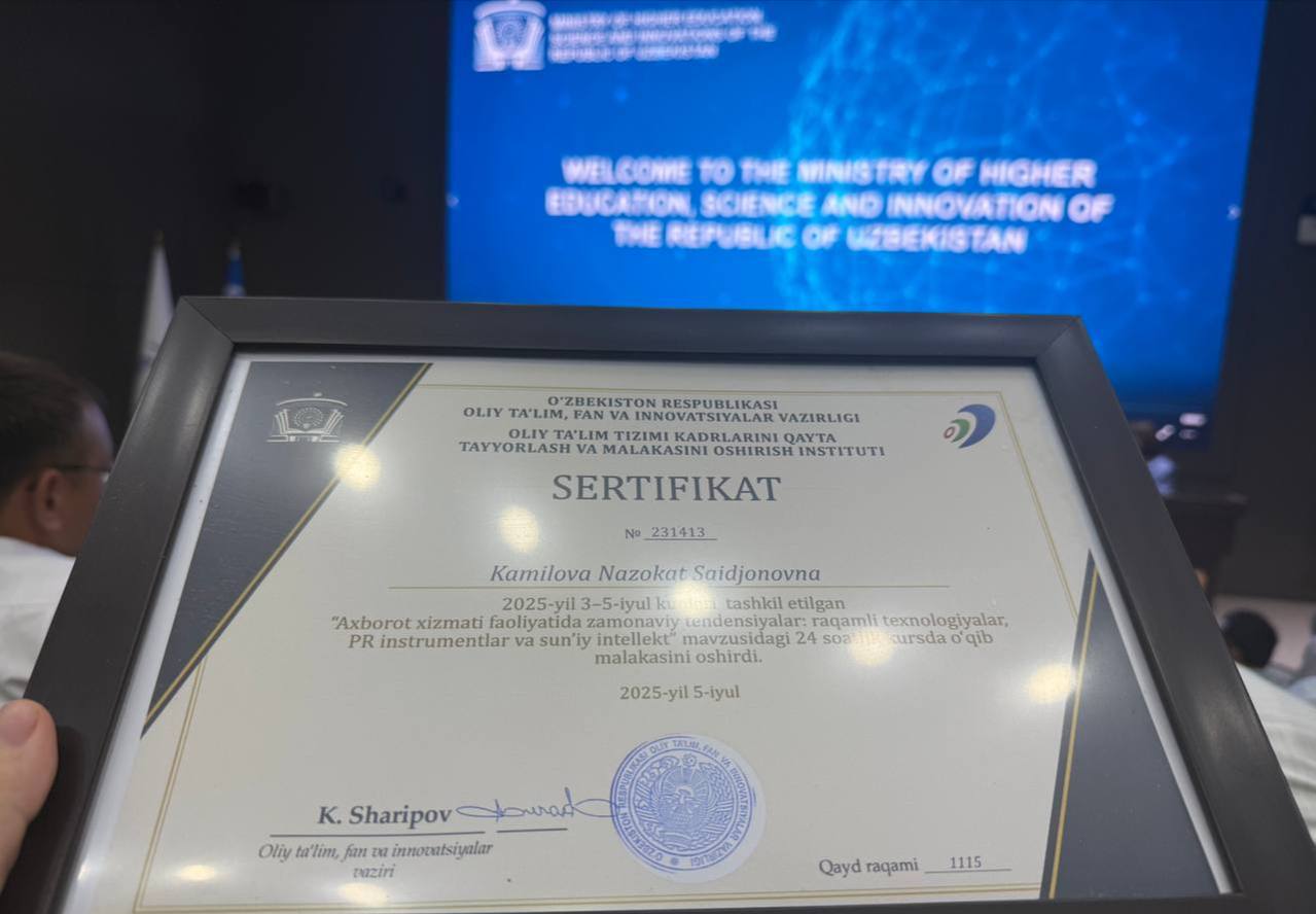 Oliy ta’lim, fan va innovatsiyalar vazirligi tomonidan 3-5 iyul kunlari oʻtkazilgan “Axborot xizmati faoliyatida zamonaviy tendensiyalar: raqamli texnologiyalar, PR instrumentlar va sun’iy intellekt” mavzusidagi malaka oshirish kurslarining birinchi chaqiruvi yakunlandi.