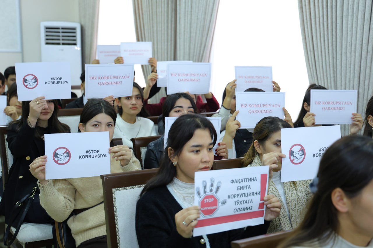 "Stop korrupsiya!" mavzusida tashkil etilgan targ‘ibot tadbirida yoshlar korrupsiyaga oid qonun hujjatlari bilan yaqindan tanishtirildi, korrupsiyaviy holatlarning oldini olish bo‘yicha fikr-mulohazalar bildirildi hamda yoshlarni qiziqtirgan savollarga mas’ullar tomonidan batafsil javoblar berildi.