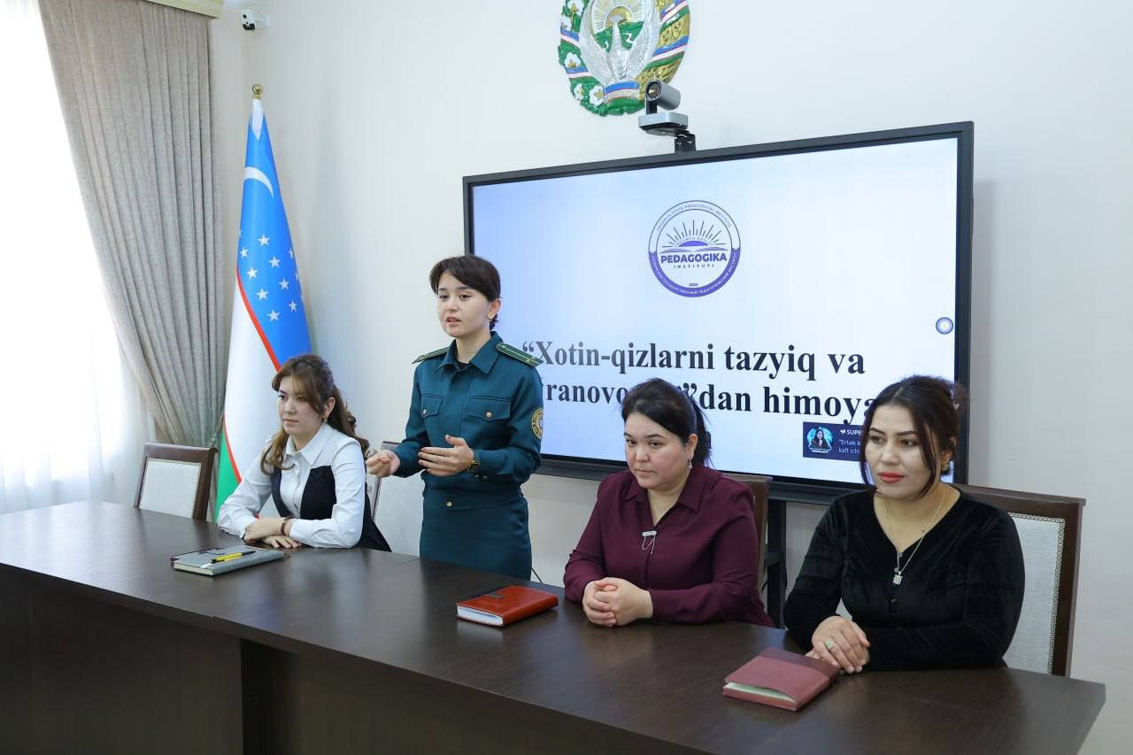 Urganch davlat pedagogika institutida talaba xotin-qizlarni tazyiq va zo‘ravonlikdan himoya qilish, ta’lim muhitida xavfsizlik hamda o‘zaro hurmat muhitini mustahkamlash maqsadida davra suhbati tashkil etildi. Unda institut psixologlari M.Sa’dullayeva, M.Nazarova hamda profilaktika inspektori S.Qadamboyeva ishtirok etib, mavzu yuzasidan muhim fikr-mulohazalar bildirdilar.