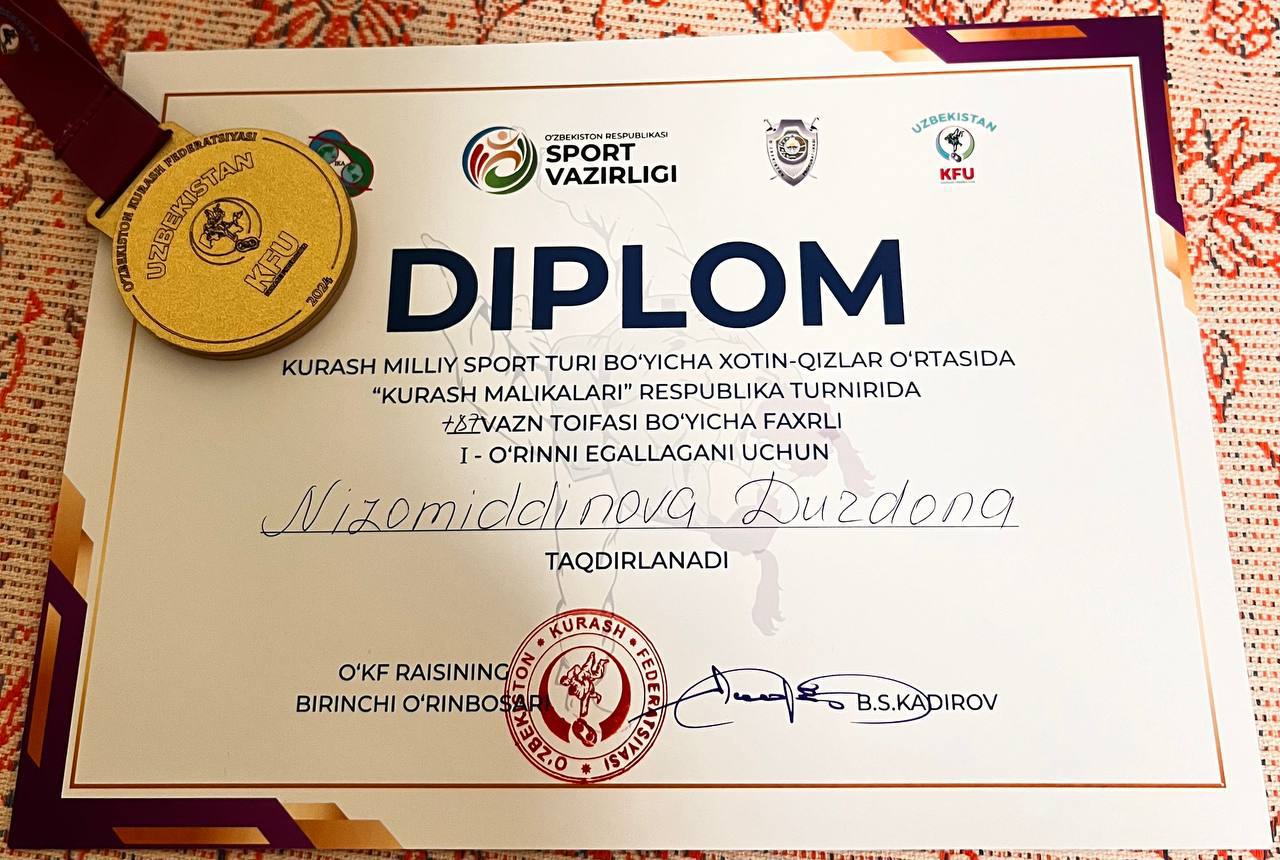 Urganch davlat pedagogika instituti Aniq va amaliy fanlar fakulteti Jismoniy madaniyat ta’lim yo‘nalishi 1-bosqich talabasi Nizomiddinova Durdona kurash milliy sport turi bo‘yicha xotin-qizlar o‘rtasida o‘tkazilgan “Kurash malikalari” respublika turnirida faxrli 1-o‘rinni egalladi.